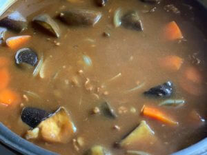 早速、朝からカレーを 我が家で一番大きい鍋で作りました。